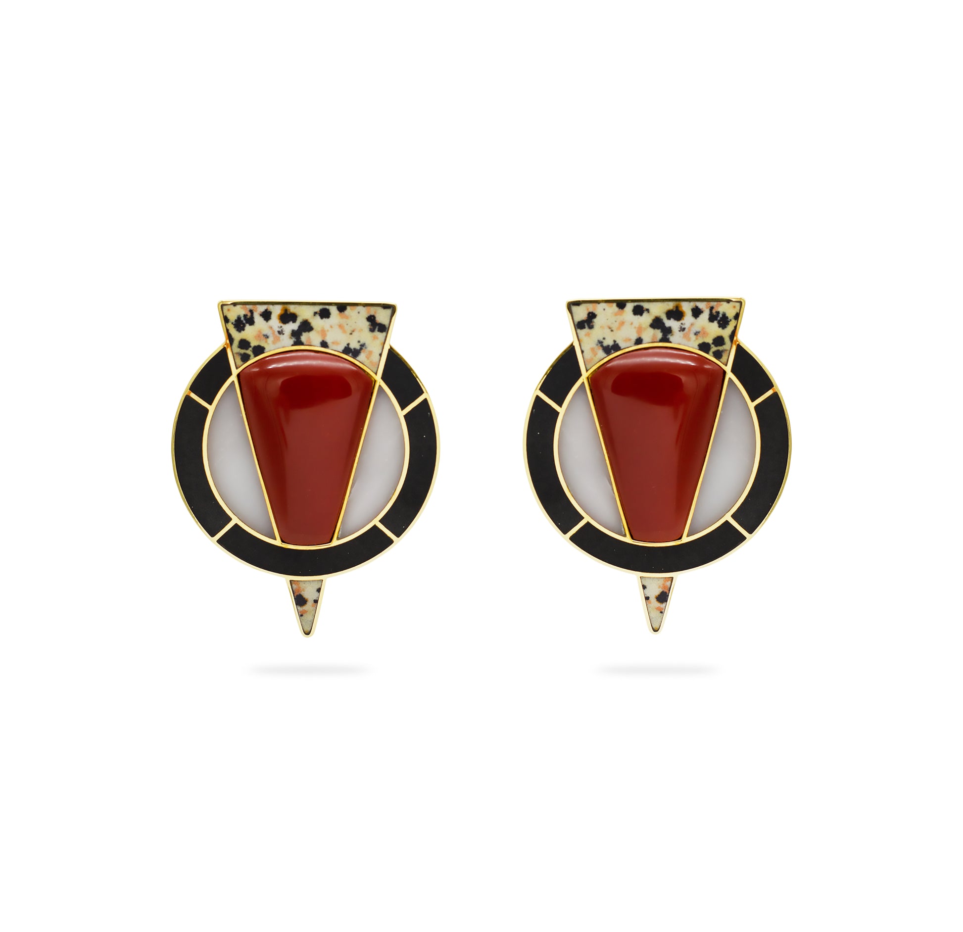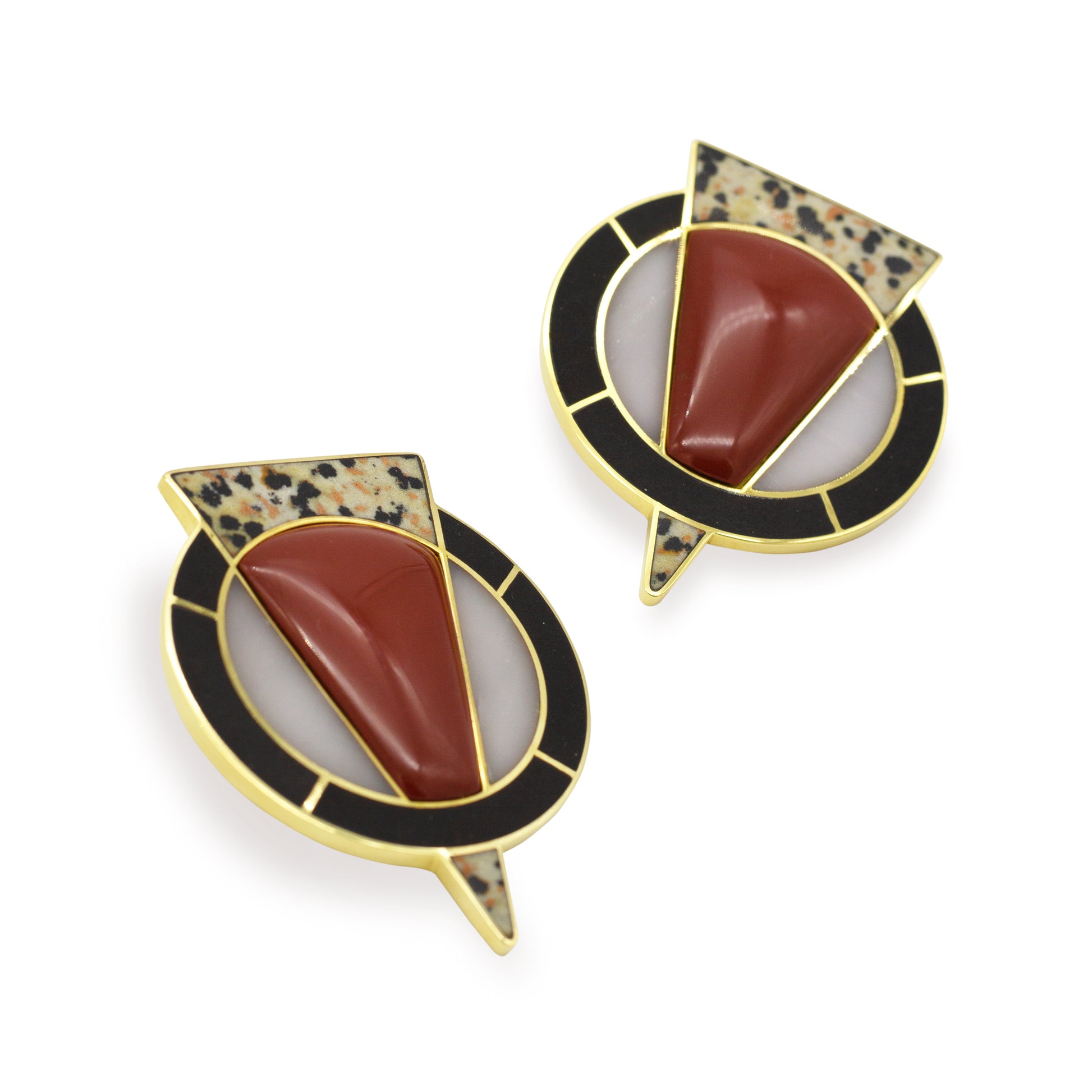 This piece features Black Onyx, Red Jasper, White Jasper and Jasper Dalmatite stone set on 24 kt gold-plated brass. It measures approximately 5 cm in length and 4 cm in width. We work with natural stones, which makes every jewel truly one of a kind.