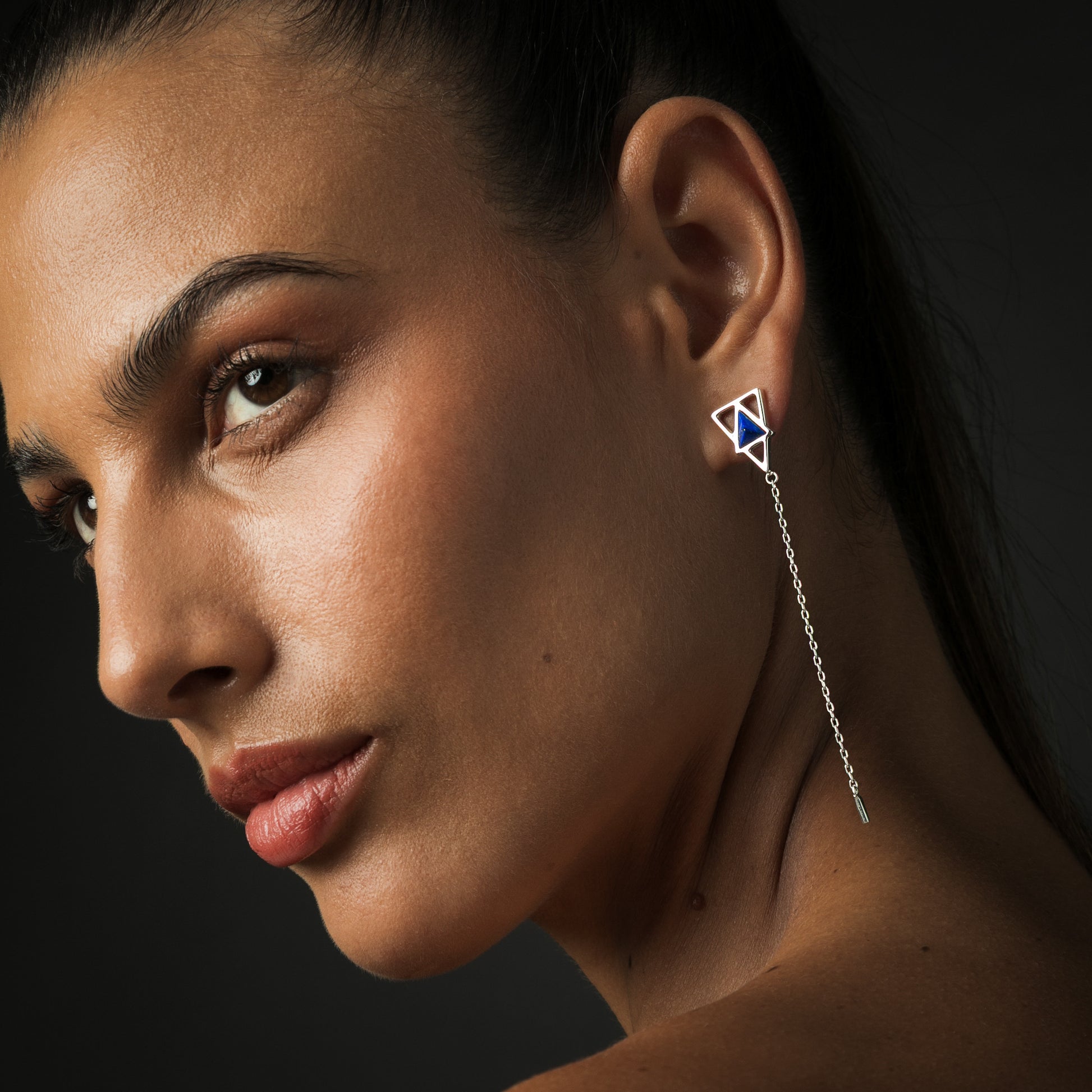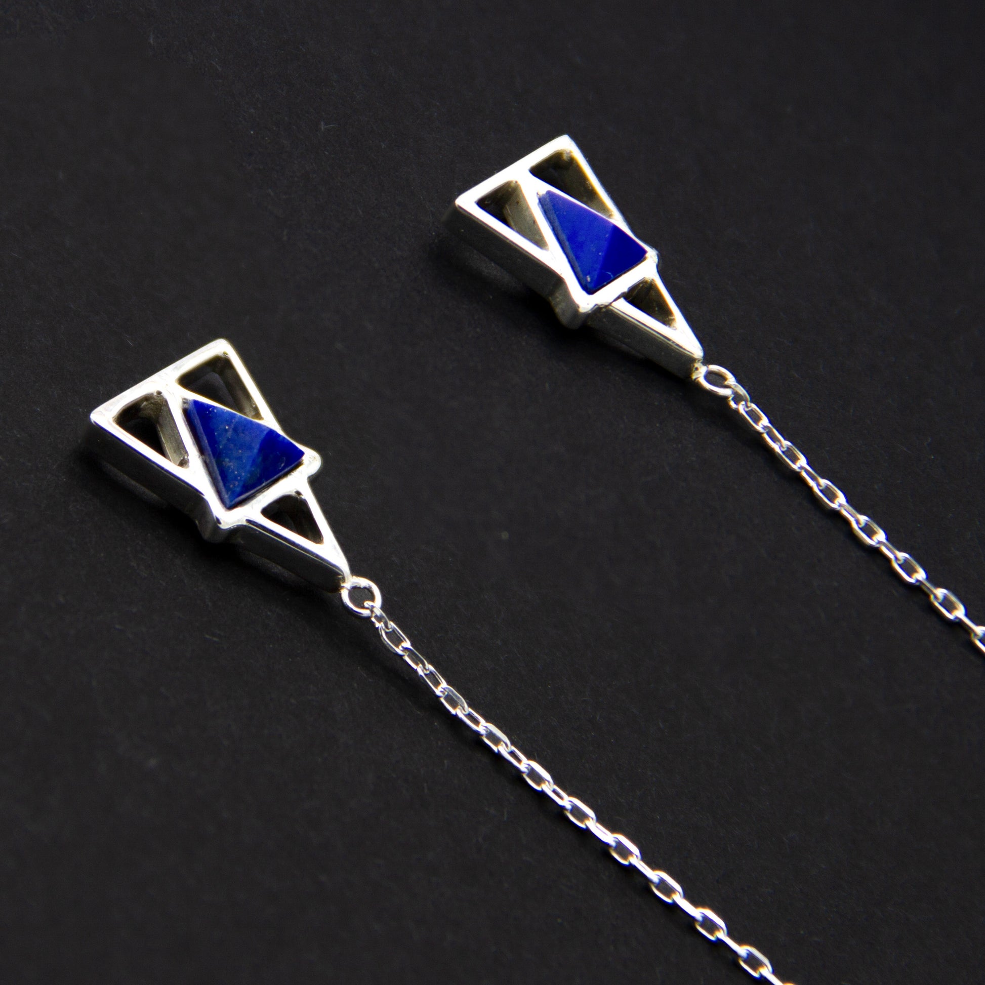 Delicate geometric earrings with an Lapislazuli pyramid set on sterling silver.